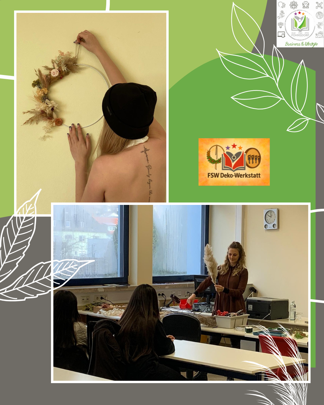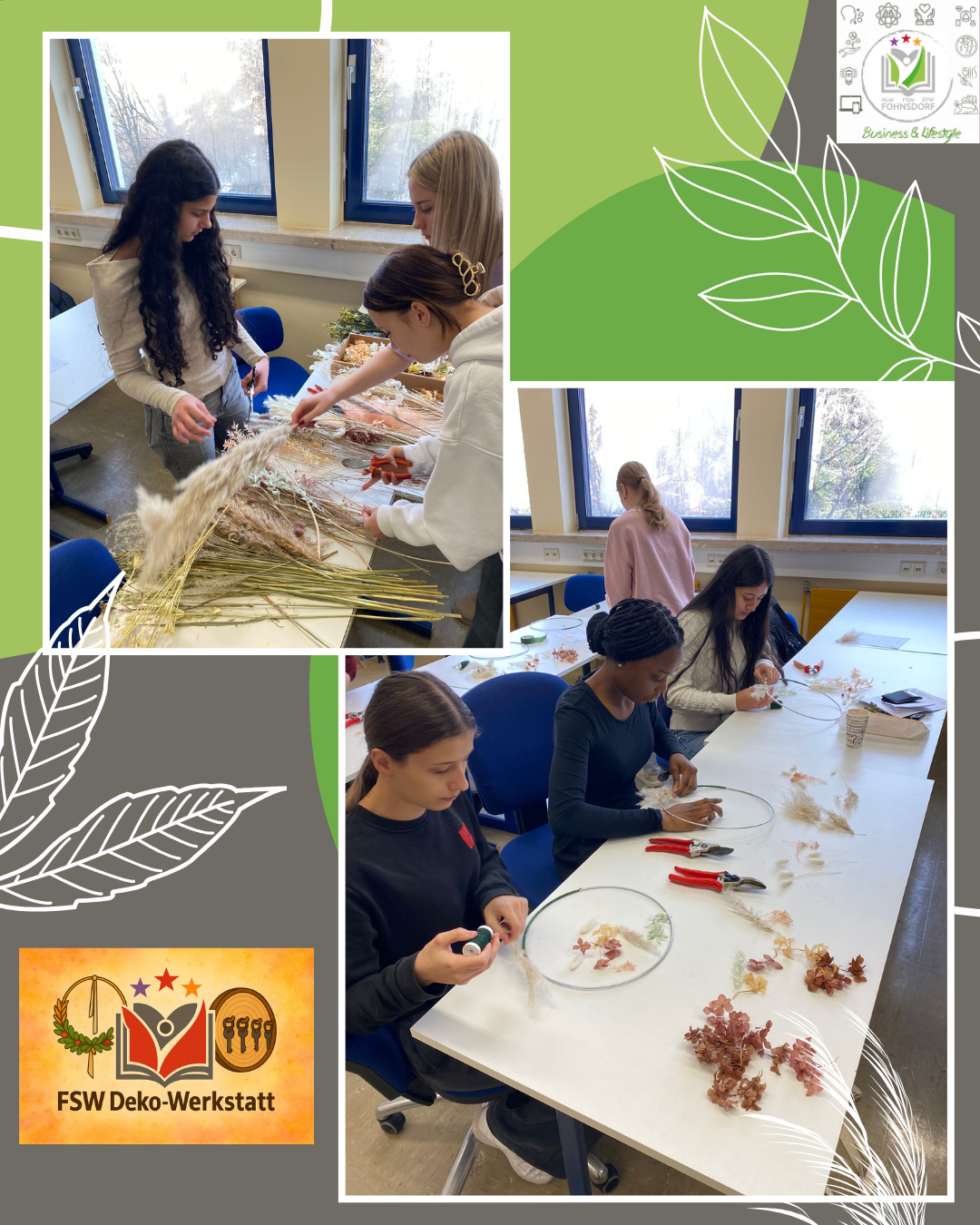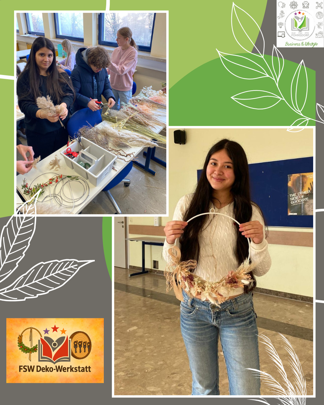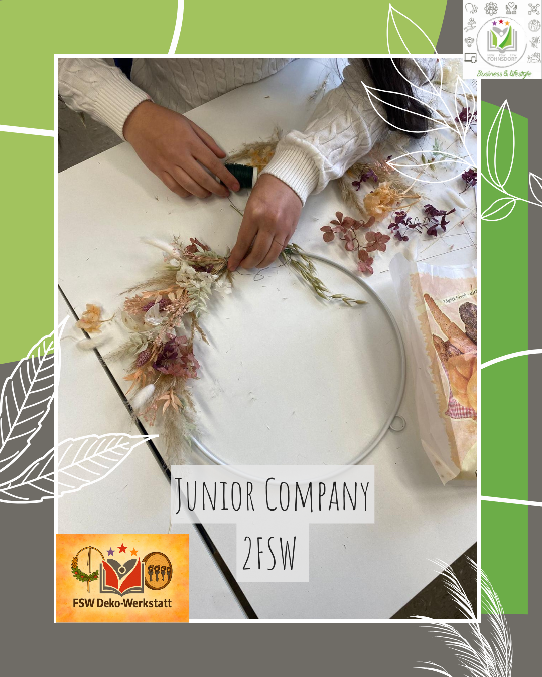 Im Rahmen ihrer Junior Company FSW Deko‑Werkstatt entschieden sich die Schüler:innen der 2FSW, nachhaltige Produkte herzustellen. Dabei liegt der Fokus auf dekorativen Elementen aus Naturmaterialien, mit denen Wohn‑ sowie Arbeitsräume verschönert und eine angenehme, einladende Atmosphäre geschaffen werden soll.