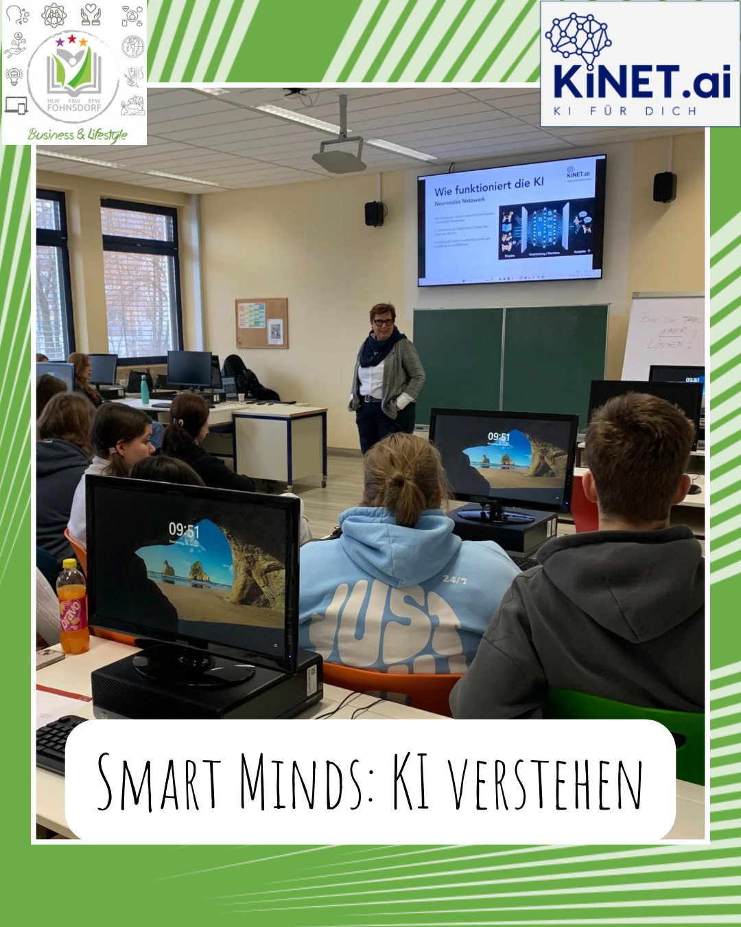 In einem einstündigen Workshop erhielten die Schülerinnen und Schüler des zweiten und dritten Jahrgangs spannende Einblicke in die Welt der Künstlichen Intelligenz. Frau Machner Manuela, KI‑Expertin, erklärte anschaulich, wie KI funktioniert, wo ihr Einsatz sinnvoll ist und an welchen Stellen sie noch Fehler macht oder Risiken birgt. Die Lernenden erhielten zahlreiche praktische Tipps zum verantwortungsvollen Umgang mit KI. Um die Funktionsweise ihrer smarten Brille zu demonstrieren, fertigte sie einmal kurz ein Foto und eine kurze Videoaufnahme der Gruppe an. Die Zeit verging angesichts des faszinierenden Themas wie im Flug – der Workshop hätte problemlos doppelt so lang sein können.