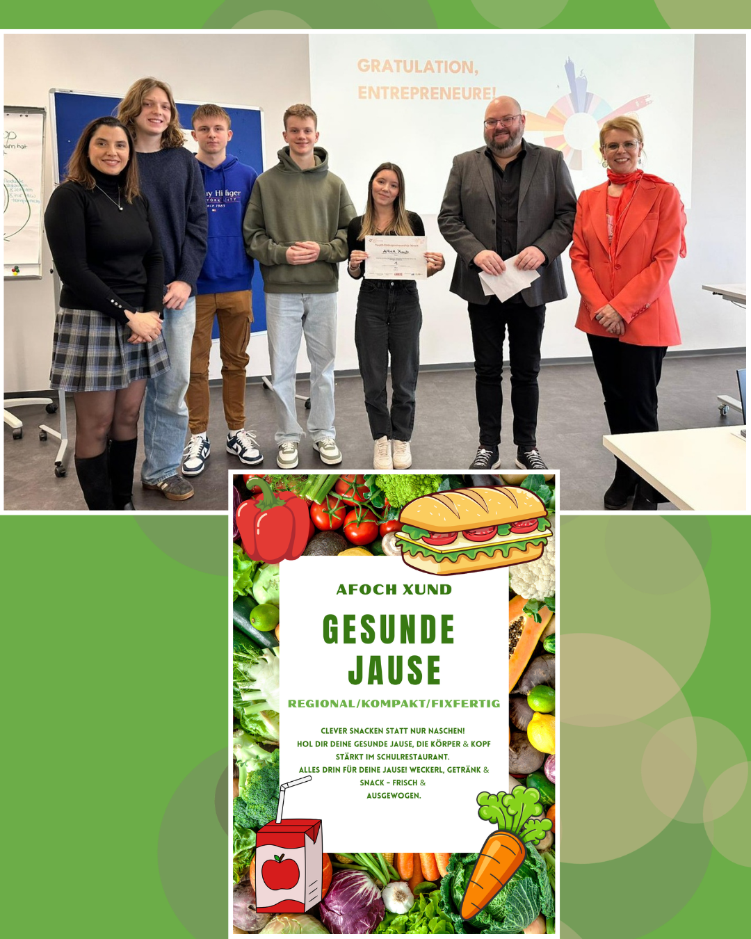 Zu den Projekten zählten unter anderem „Green Loop“ zur Weiterverwertung überschüssiger Lebensmittel, der 24‑Stunden‑Shop „ Rundumadum für di da“, die gesunde Schuljause „Afoch xund“, die Planungs‑App „ Daily Structure“ sowie „Drop4change“ für das Spenden von Pfand. Das Siegerprojekt „Afoch xund“ erhielt ein Preisgeld von 250 Euro, und das Team „Green Loop“ qualifizierte sich zusätzlich für den bundesweiten Greenstar(t) Award.