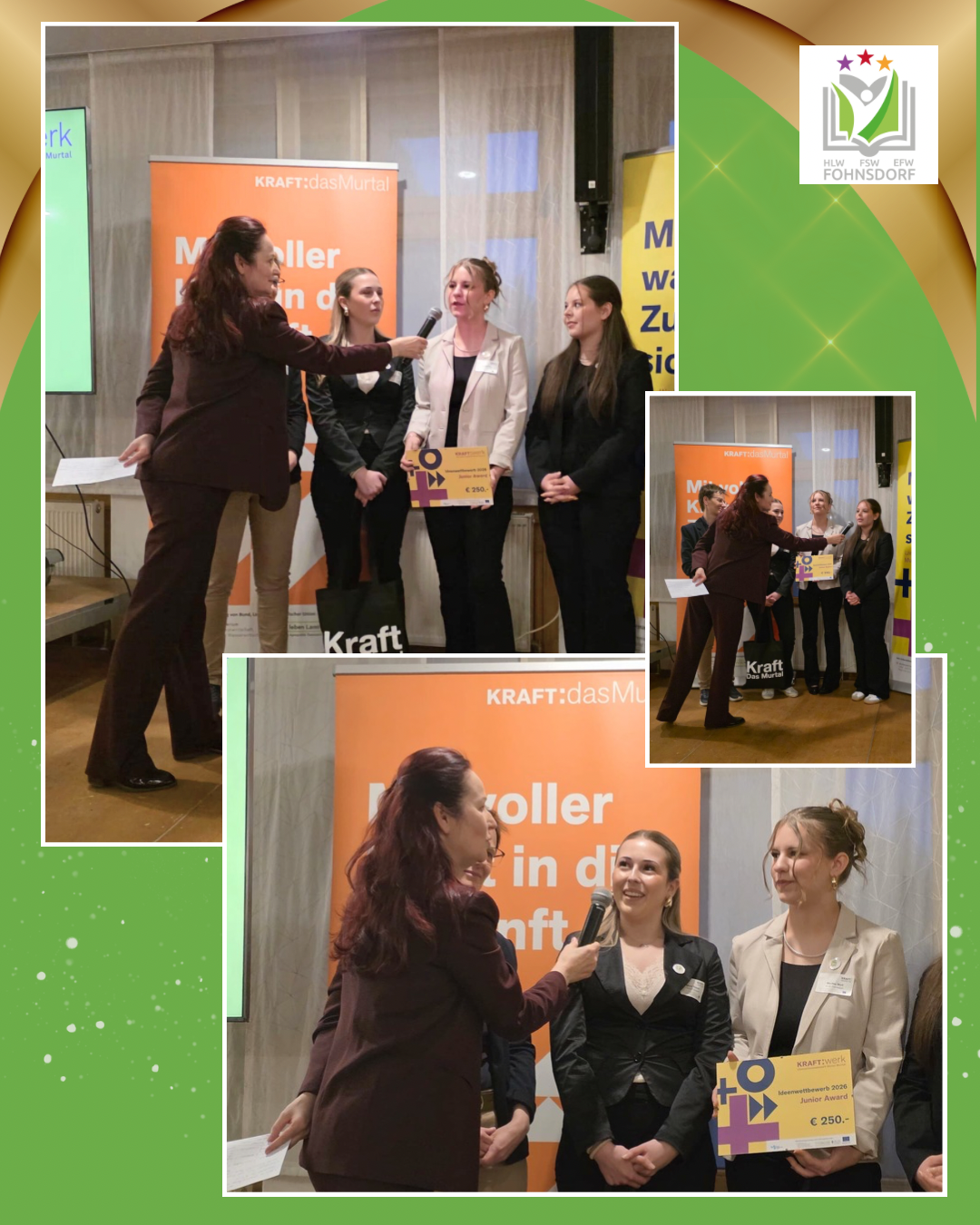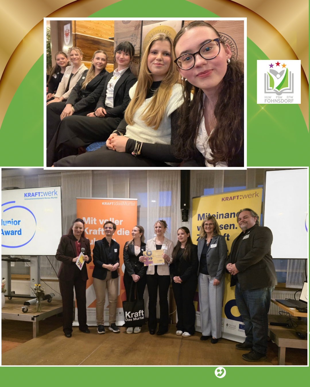 Das zukunftsfähige Projekt „Grow Together“ wurde bei einer feierlichen Preisverleihung im Brauhaus zu Murau mit dem Junior Award ausgezeichnet. Die Schülerinnen Marlies Wolf, Gloria Brandl und Lina Spies nahmen stellvertretend für ihr Projektteam stolz einen Gutschein im Wert von 250 Euro entgegen. Mit im Team waren weiters Franziska Potocnik, Roxana Cuk, Mavie Freigassner und Janine Harb. Ihr Innovationspotential und persönliches Engagement wurde auf diese Weise belohnt. Wir gratulieren ganz herzlich und bedanken uns beim Wettbewerbsveranstalter KRAFT:werk für diese besondere Auszeichnung!